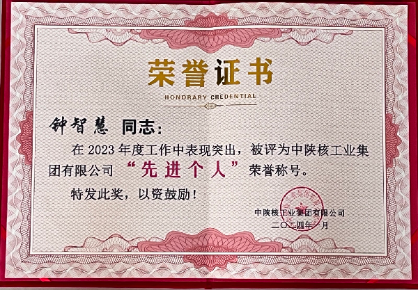 中陕核工业集团有限公司2023年度先进个人 钟智慧