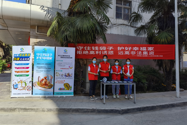 [2022-06-15]公司开展“守住钱袋子·护好幸福家”防范非法集资普法宣传教育活...为深入贯彻落实《防范和处置非法集资条例》,结合全国打击整治养老诈骗专项行动,响应陕西省2022年防范非法集资宣传月活动,增强人民群众对非法集资的防范意识和能力,6月...