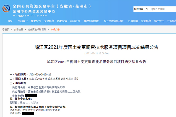 [2022-02-24]测绘院成功中标鸠江区2021年度国土变更调查技术服务项目2月21日,从芜湖市公共资源交易中心网站获悉,测绘院成功中标鸠江区2021年度国土变更调查技术服务项目。本次项目的主要工作内容是收集整理鸠江区相关监测及自然资源管理信...