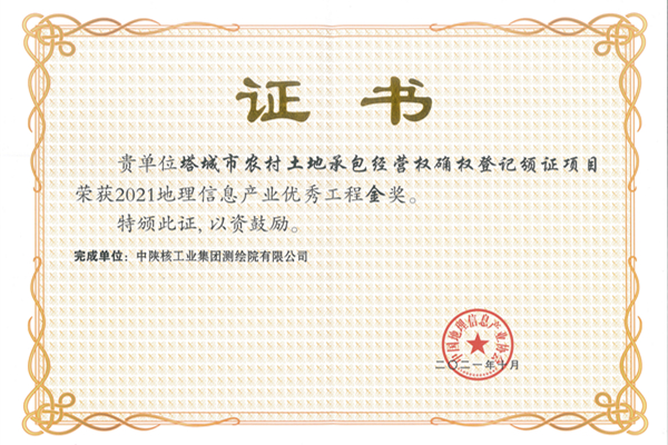 [2021-10-19]中陕核测绘院荣获中国地理信息产业协会“2021中国地理信息产业优...10月,中国地理信息产业协会2021年度国家优质工程奖评选结果揭晓,中陕核工业集团测绘院有限公司塔城市农村土地承包经营权确权登记颁证项目荣获中国地理信息产业协会“202...