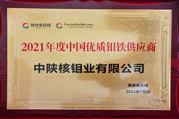 [2021-07-15]中陕核钼业有限公司被铁合金在线网评为“2021年度中国优质钼铁供...7月7日至9日,由铁合金在线网主办的2021中国钼产业发展论坛在河南栾川召开。中陕核钼业有限公司被铁合金在线网评为“2021年度中国优质钼铁供应商”?;嵋槠诩?,公司总经理...