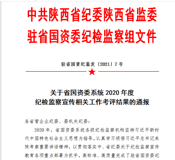 [2021-05-17]公司3篇作品在省国资委系统2020年纪检监察宣传作品评选活动中获...近日,中共陕西省纪委陕西省监委驻省国资委纪检监察组下发了《关于省国资委系统2020年度纪检监察宣传相关工作考评结果的通报》,闫妮《传承美好家风弘扬廉洁美德——中陕核...