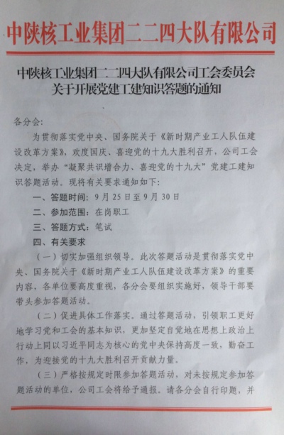 [2017-09-27]公司开展“迎接党的十九大”党建工建知识答题活动为庆祝祖国68岁华诞,迎接党的十九大胜利召开,全面贯彻落实党中央、国务院关于《新时期产业工人队伍建设改革方案》,公司举办凝聚共识增合力,迎接党的十九大党建工建知识...