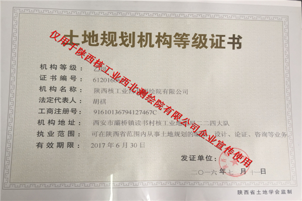 [2016-07-19]陕核西北测绘院平台建设再添新证7月15日,陕核西北测绘院成功取得土地规划乙级资质,这标志着测绘院从测绘技术服务行业进军规划设计行业,业务范围成功实现向土地利用规划编制、设计、论证、咨询及土地整...