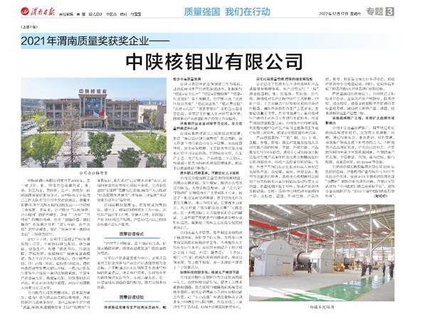 [2022-12-22]喜讯!中陕核钼业有限公司荣获“2021年渭南质量奖”近日,通过《渭南市人民政府办公室关于2021年渭南质量奖渭南质量奖提名奖及标准化工作先进的通报》(渭政办发[2022]71号)文件获知,中陕核钼业有限公司成功荣获“2021年渭...