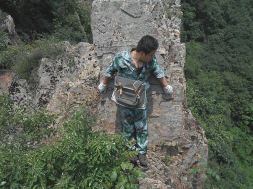 图上是陈哥和我爬上海拔1294m的山顶后拍摄的,该点点号D2410,是一个伽玛异常点。测量时,我们在前一个点就发现伽玛值偏高,而那座山体倾角已超过70度,所处的石英片岩区域风化程度很高,有些地方一脚就可以把岩石踩断。但陈哥说这里异常值较高,我们需要上到那个点,测量这条异常带延续到什么位置,于是我俩提了提裤腰带,找能踩脚的位置慢慢往上爬。终于,我们登上了山顶,测量和记录好数据后,却发现根本无法原路返回,于是就选择了照片上陈哥脚踩的那个陡崖,崖壁最窄的位置只够放两只脚?;购贸赂绲囊巴夤ぷ骶榉岣?,在他的带领和指导下,我们终于幸运的爬到了旁边的山梁上,从而安全的下了山。双槽地区地层陡峭,岩体切割强烈,断崖峭壁较多,这也只是我们一个普通小组的真实写照。