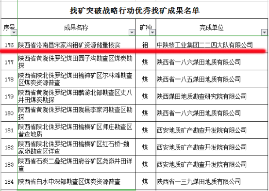 近日,自然资源部公布了284个找矿成果为找矿突破战略行动优秀找矿成果,公司申报的《陕西省洛南县宋家沟钼矿资源储量核实》项目成功入选,这也是陕西省9个上榜名单中唯一的金属矿产项目。这是公司在获得全国模范地勘单位之后取得的又一个部级奖项。