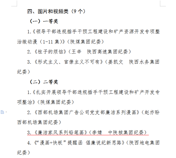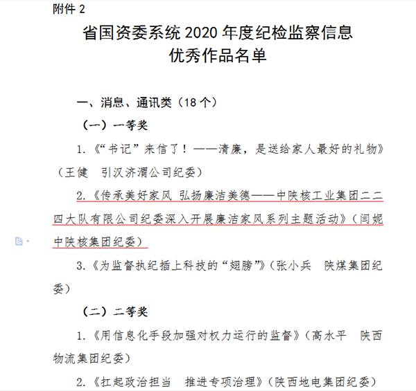 近日,中共陕西省纪委陕西省监委驻省国资委纪检监察组下发了《关于省国资委系统2020年度纪检监察宣传相关工作考评结果的通报》,闫妮《传承美好家风 弘扬廉洁美德——中陕核工业集团二二四大队有限公司纪委深入开展廉洁家风系列主题活动》荣获省国资委系统2020年度纪检监察信息优秀作品消息、通讯类“一等奖”,闫妮《关于新时代国有地勘企业廉洁风险与防控机制建设的探索》荣获理论研究类作品“二等奖”;李婧《廉洁家风系列铅笔画》荣获图片和视频类作品“二等奖”。