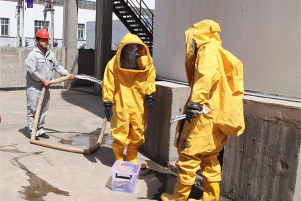 公司总经理助理、钼业公司总经理王强为本次演练总指挥。演练现场,王强总指挥接到硫酸车间硫酸罐底部阀门法兰处发生泄漏的报告后,立即下令启动公司硫酸罐泄露应急处置专项预案,应急救援队伍火速赶往事发地点。警戒疏散组迅速拉起警戒带对现场进行隔离,应急救护组对伤员进行紧急救护,现场处置组对泄露区进行喷水稀释,应急抢险组身着防护服、正压呼吸器对泄露部位更换损坏法兰,对泄露罐体进行密封。经过应急处置,泄漏得到有效控制,险情排除,演练圆满结束。