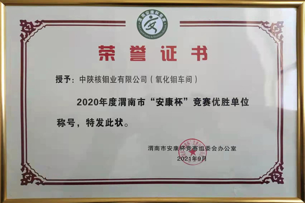 近日,中陕核钼业有限公司在“安康杯”竞赛活动中,捷报频传。经渭南市“安康杯”竞赛组委会决定,授予中陕核钼业有限公司2020年度渭南市“安康杯”竞赛“优胜单位”称号。与此同时,授予氧化钼车间2020年度渭南市“安康杯”竞赛“优胜单位”,授予李飞龙同志2020年度渭南市“安康杯”竞赛“优秀个人”称号。