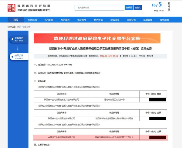 中标喜讯!中陕核工业集团测绘院有限公司成功中标“陕西省2024年度矿业权人勘查开采信息公示实地核查采购项目”3标段