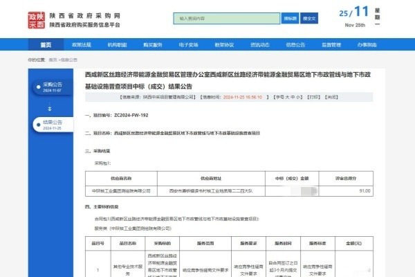 11月25日,从陕西省政府采购网获悉,中陕核工业集团测绘院有限公司成功中标西咸新区丝路经济带能源金融贸易区地下市政管线与地下市政基础设施普查项目。