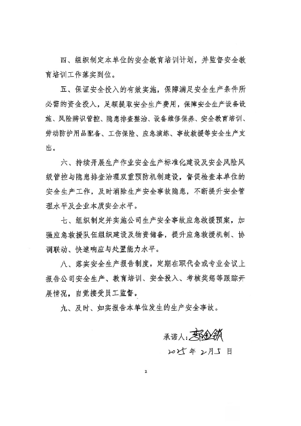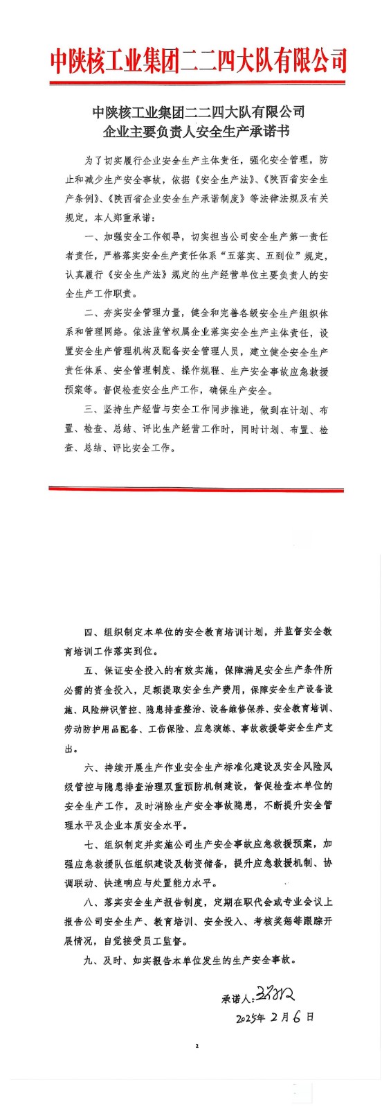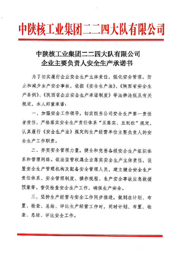 中陕核工业集团二二四大队有限公司企业主要负责人安全生产承诺书