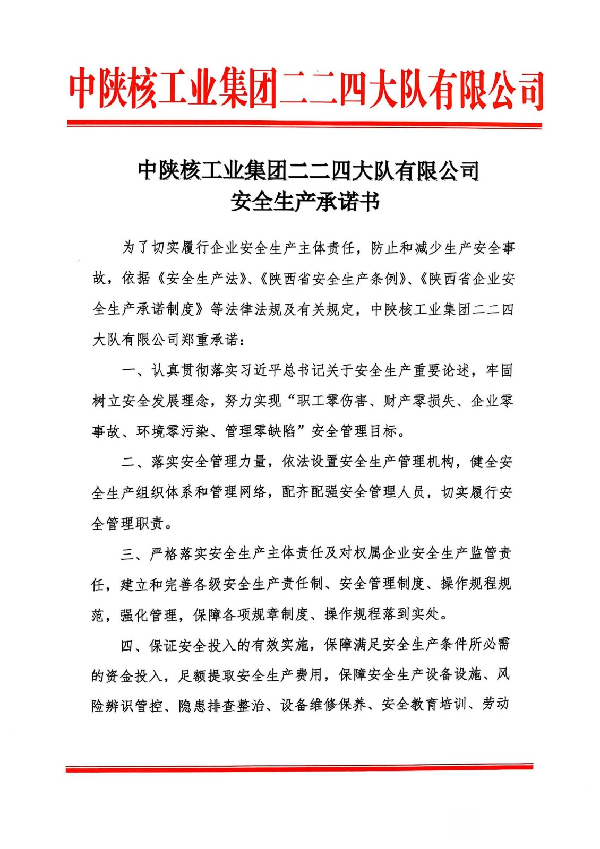 中陕核工业集团二二四大队有限公司安全生产承诺书